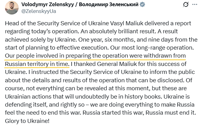 NEW: Ukrainian SBU’s Operation “Web” Took 1.5 Years to Prepare Ukraine’s SBU spent over 18 months planning the massive “Web” operation that struck 41 Russian strategic aircraft today. President Zelensky personally oversaw the mission, with SBU chief Vasyl Maliuk leading execution. Sources say the complex logistics involved smuggling FPV drones and mobile wooden cabins into Russia. The drones were hidden under remote-controlled roofs on trucks. When triggered, the roofs opened and kamikaze drones launched toward Russian bombers. SBU insiders stress that all operatives involved are already safely back in Ukraine. Any arrests by Russian authorities will likely be staged for domestic propaganda.