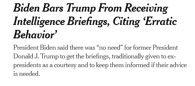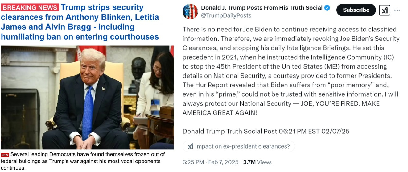 Less glamorized were Trump’s security clearance revocations of key figures like Antony Blinken and Jake Sullivan, as well as the stripping of Biden of his daily classified intelligence briefings, which apparently ex-presidents receive as some kind of ‘courtesy’: