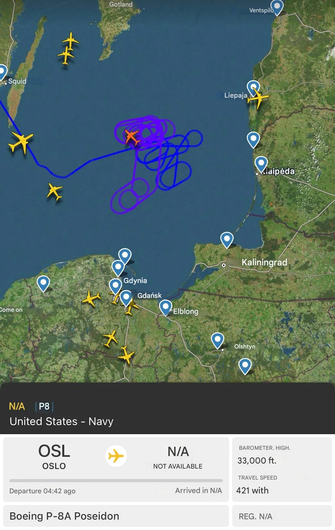 Meanwhile, a P-8A Poseidon of the US Navy has been circling over the Baltic Sea near the Kaliningrad region for several hours.