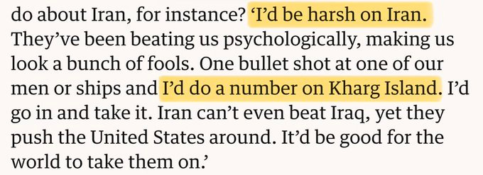 In the wake of the attacks, it has come to light that Trump has a long history of hardline fanaticism when it comes to anti-Iranian attitudes. Newly uncovered interviews have shown he has been talking about taking Kharg Island as far back as the ‘80s: