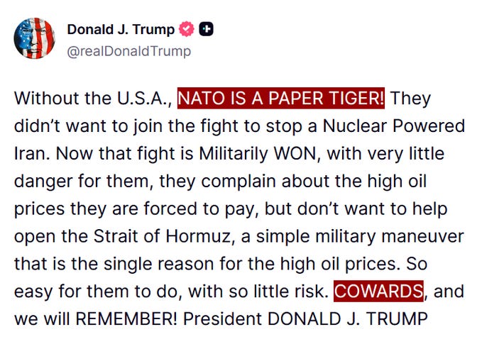 Not only publicly shaming his top allies by calling them outright cowards, but admitting that NATO is a useless paper tiger. A day or two earlier he even again hinted that the US should look at withdrawing from NATO.