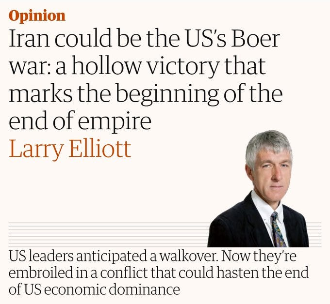 The Guardian makes an interesting historical comparison, highlighting the decline of the British Empire as tokenized by the Boer War of 1899: