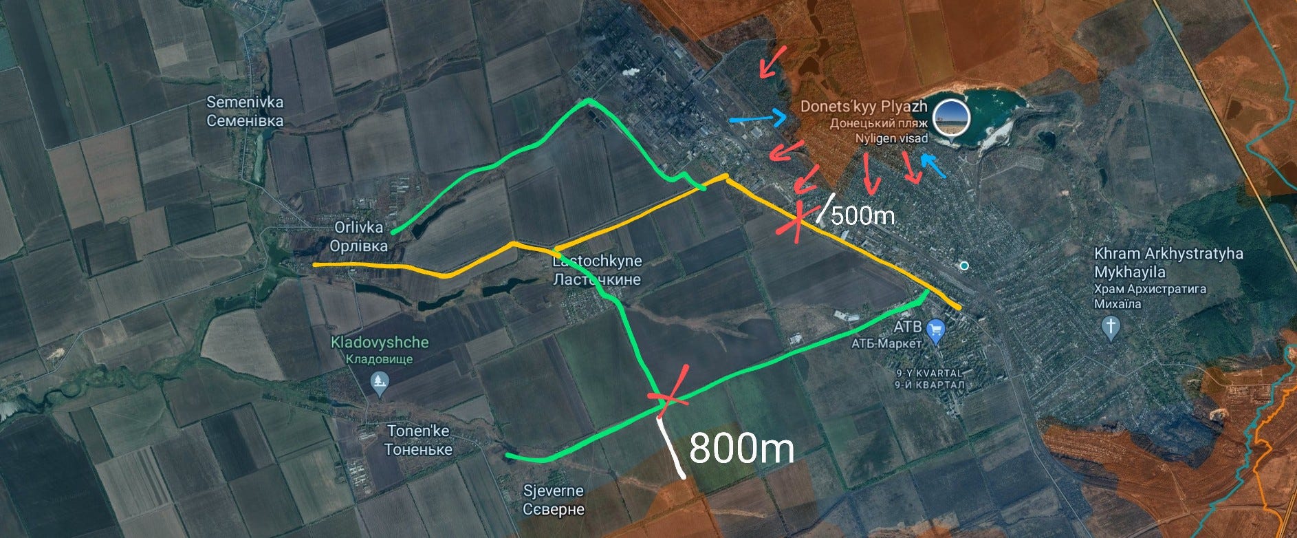 The main MSR in yellow through Lastochkino would be severed for the forces in the south of Avdeevka.