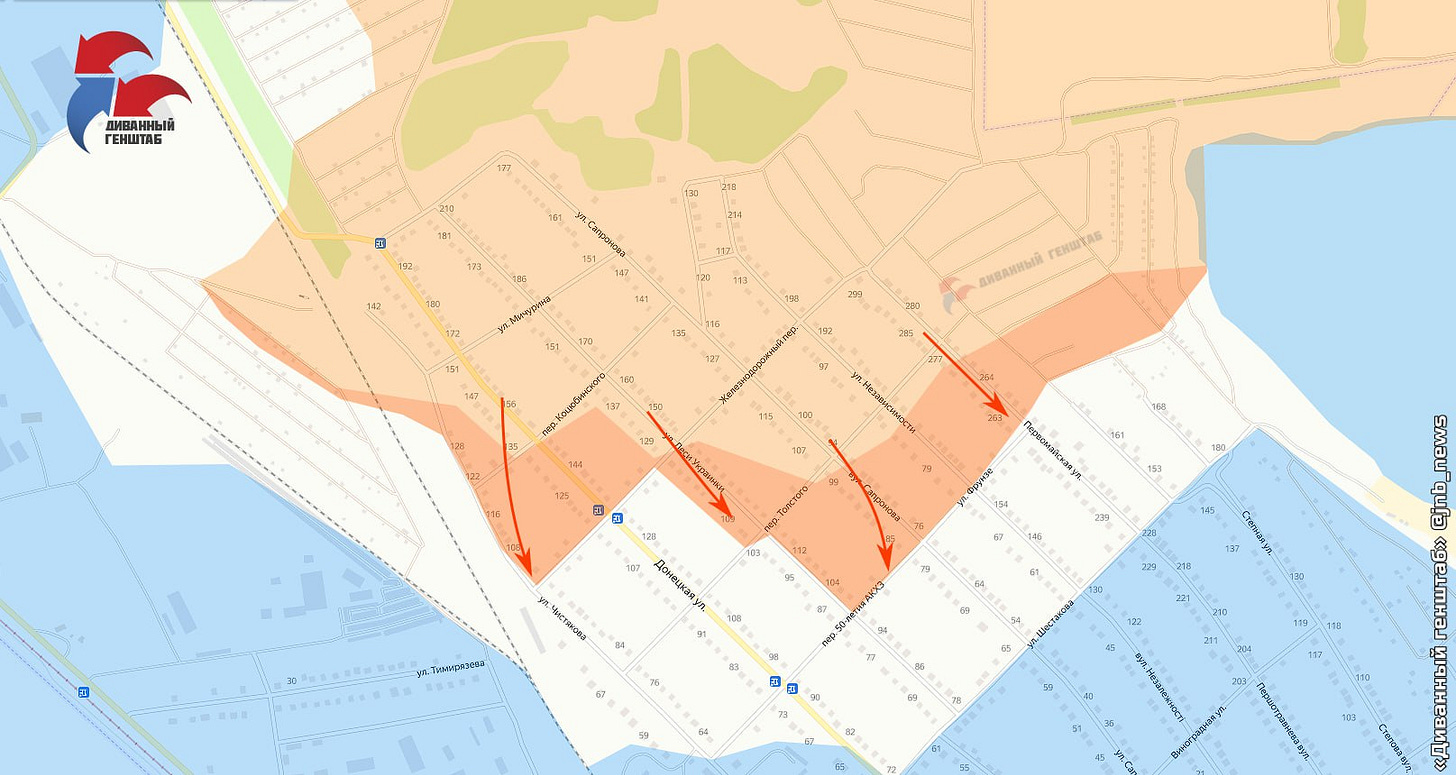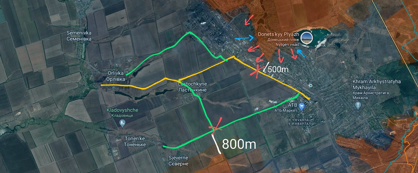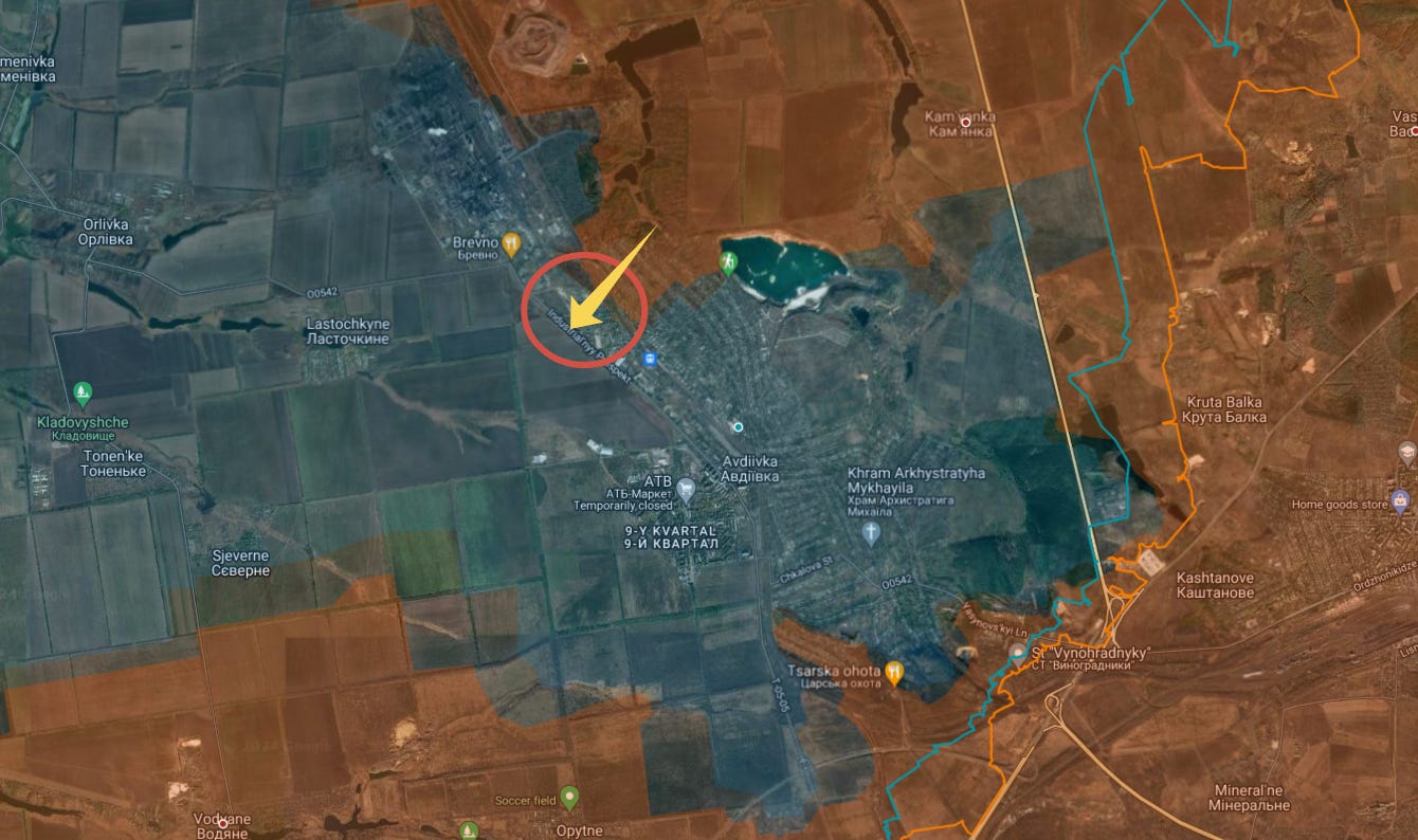 As can be seen, only a narrow strip of land about 400-500m wide stands between Russian forces and the edge of the residential sector there. That means the entire southern quarter of Avdeevka would be soon cut off from the north AKHZ Coke Plant sector.