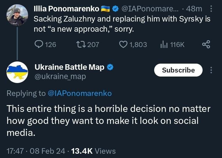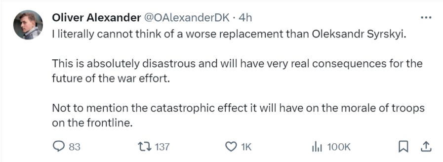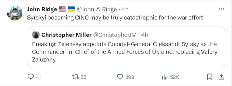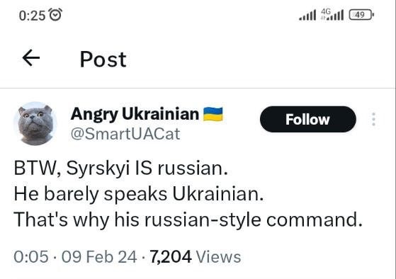 So, has it become obvious yet? Zelensky needs a commander-in-chief he can control, someone not universally loved by the troops; someone who cannot use those troops at a time of opportunity to ‘march on Kiev’ and oust Zelensky from his citadel. Syrsky appears to fit the perfect prototypical role: undefiant, unpopular, uncharismatic, and most importantly, untempted by political ambitions—the ideal subserviant factotum to Zelensky’s regime.