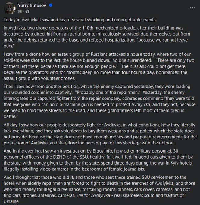 There are rumors that the command of the Armed Forces of Ukraine approved the withdrawal from Avdeevka. They are already mining some of the houses that are still ahead of us. This indicates that they actually want to withdraw. But it is definitely too early to talk about a complete withdrawal. There continues to be heavy fighting in the city.