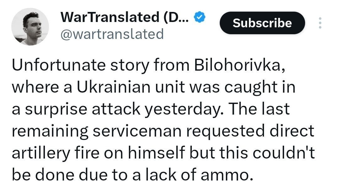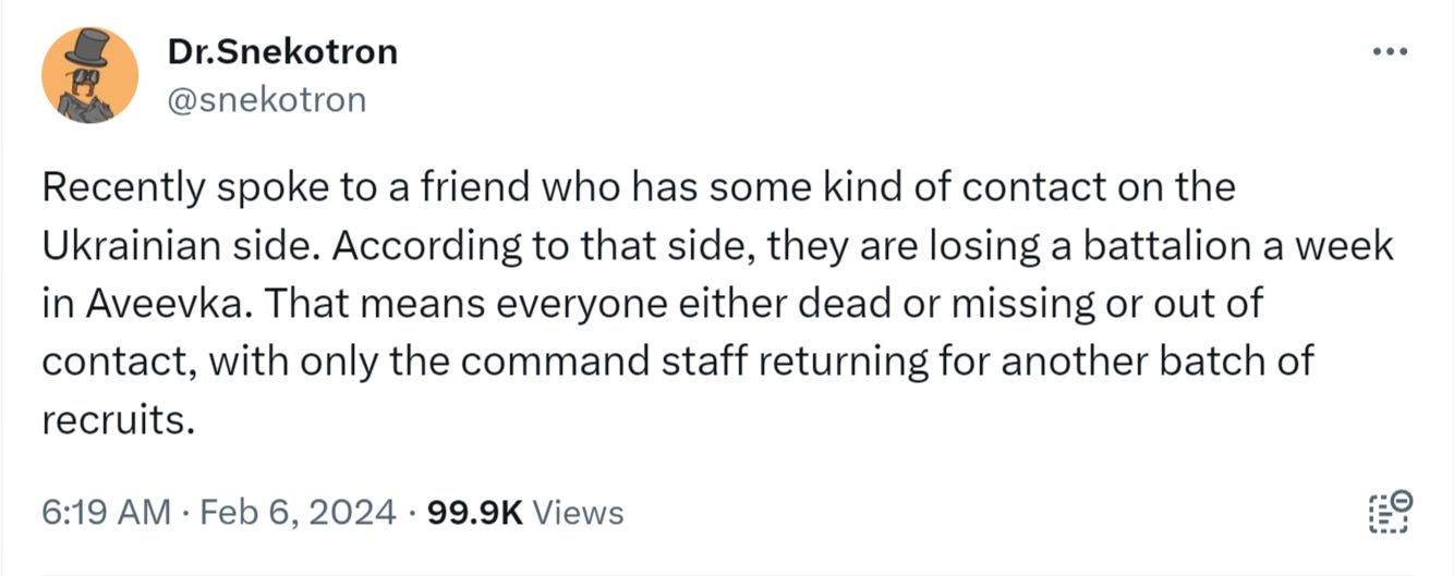 But to get back to Avdeevka: the reports of losses in the AFU there are terrible. Such an anecdotal one says they’re losing a battalion a week just there alone:
