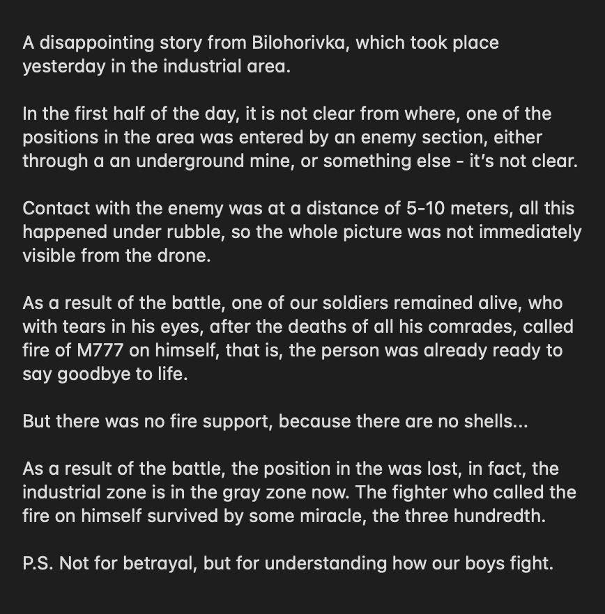 This is partly why some are dubbing him ‘General 200’ or the ‘Boiler Master’. His specialty appears to be getting his troops into killboxed boilers wherein he waits to the last moment to withdraw, when the troops are already all ground down. He also famously called Russian troops in Bakhmut ‘semi-encircled’—one of the more famous examples of ‘cope’ in the war thus far: