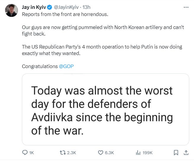 The key takeaway, however, is that Zaluzhny may have been dragging his feet, deliberately ‘sabotaging’ the Avdeevka front by withholding the transfer of reserves so as to force a withdrawal, knowing that it’s hopeless to fight bitterly for it while losing mountains of men. Syrsky on the other hand has no such compunctions and is happy to turn Avdeevka into Bakhmut 2.0—at least according to these rumors.