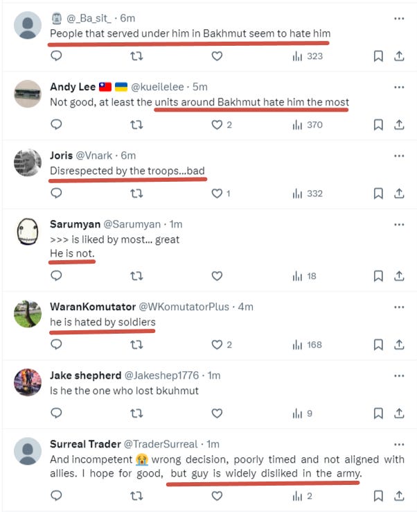He’s being called a ‘butcher’ and is known in other circles as a meat-grinder who refused to give an inch in Bakhmut while calling for frontal meat-assaults, leading to the extermination of an entire field army group.