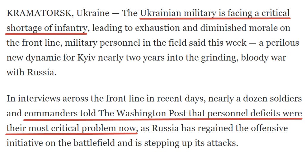 And in the past few days, reports on almost every frontline have been absolutely cataclysmic for Ukraine. The ammo shortage appears to be so bad now that they’re barely able to hold on, taking unprecedented losses in the process.