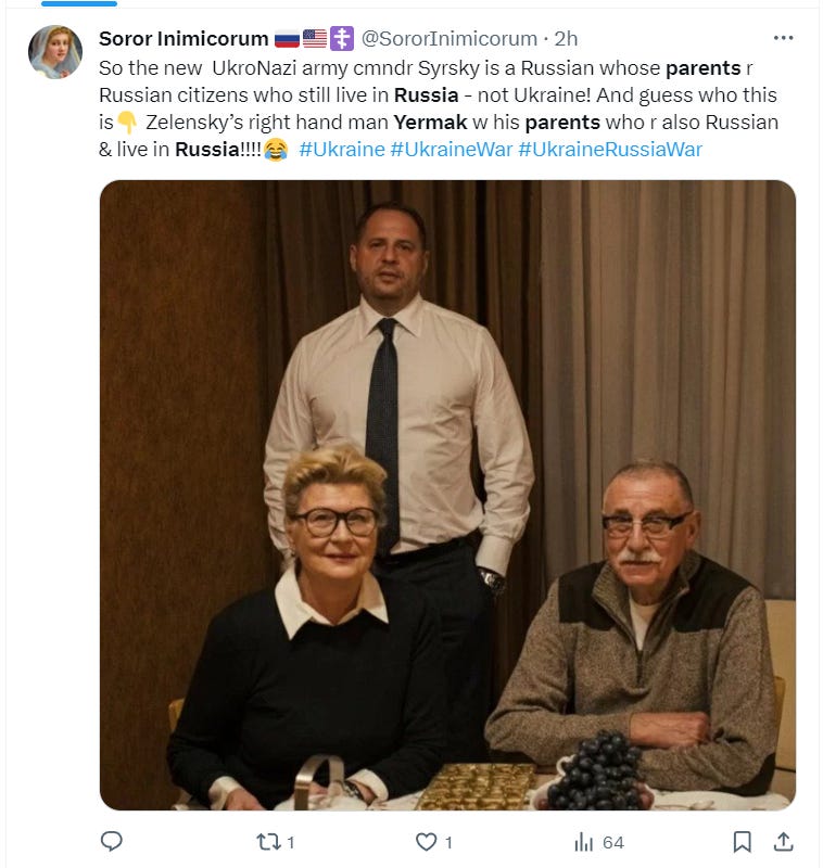 If you were startled by Syrsky’s ties to the Russian homeland, it’s only a microcosm in the larger ‘brother war’ theme. Andrey Yermak too is half Russian (Russian mother) and according to circulating reports, his parents still reside there as well:
