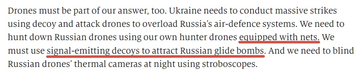 So he wants drones that shoot nets to stop Russian drones. Then he asks for signal-emitting decoys to “attract Russian glide bombs.” That doesn’t even make sense. Russian glide bombs are GPS/Glonass powered—there’s no “decoy” that can “attract” them. I can only assume he’s not referring to the famous Fab-500M62 UMPK but rather the KAB style bombs which are laser guided, and some sort of laser emitter can theoretically throw them off—but they’re not really glide bombs.