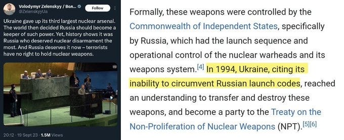 First a couple quick obligatory clarifications. Zelensky himself continues to spout the debunked lie that Ukraine “gave up its nuclear weapons” during the Budapest Memorandum.