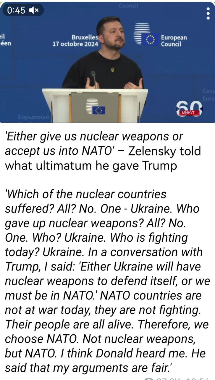 A new central flashpoint around the issue of Ukraine obtaining nuclear weapons has suddenly taken hold of the narrative after Zelensky appeared to imply that Ukraine’s future can only be secured either via NATO or nuclear weapons. In fact, he said that’s what he explained to Trump and may be the real root kernel of his ‘Victory Plan’: