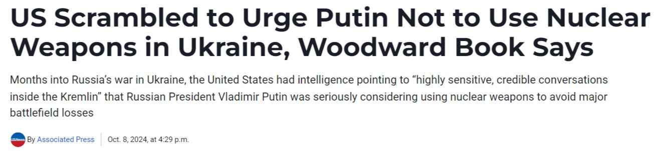 The problem is, it’s mostly too little too late, and as I said no ally would take his bait and risk nuclear war against Russia if Ukraine had acted first. This was hinted at recently in a new much-talked-about book by “legendary journalist” Bob Woodward just released three days ago: