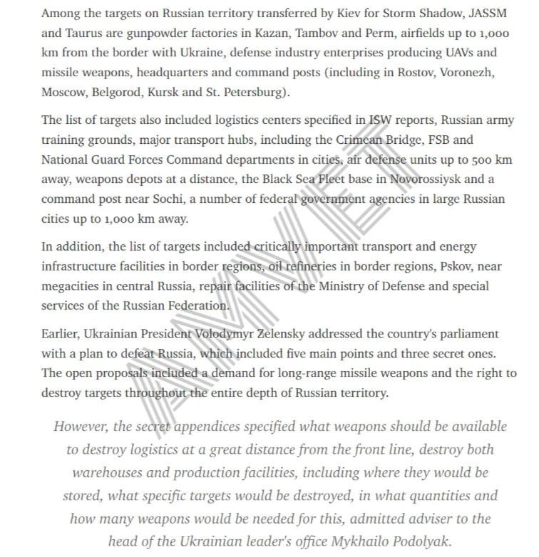 In essence, this is an expanded list of targets from ISW - it goes on to list critical infrastructure in border regions, oil refineries and "mega-terminals" like Pskov, repair shops of the Ministry of Defense and special services.