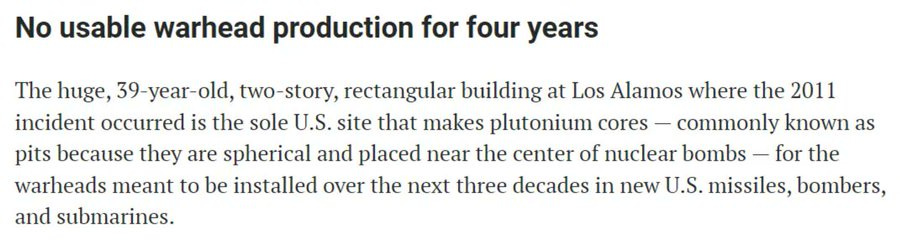 "But mostly because of the Los Alamos lab's safety deficiencies, it hasn't produced a usable new warhead core in at least six years. Congress mandated in the 2015 National Defense Authorization Act that Los Alamos must be capable of manufacturing up to 20 war-ready cores a year by 2025, 30 the next year and 80 by 2027. Wolf said the agency remains committed to meeting this goal, but other government officials say the dramatic slowdown at PF-4 has put fulfillment of that timetable in doubt."