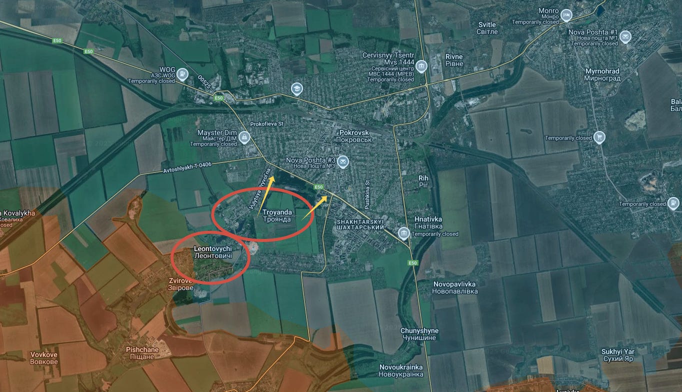 As of this writing, the absolute latest update claims that Russian forces captured both Leontovychi and Troyanda, and have already begun entering the outskirts of Pokrovsk proper in force: