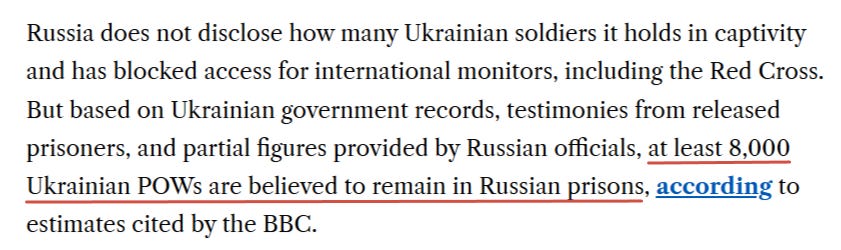 As for the exchanges, the Ukrainian side is said to have virtually no Russian prisoners left to exchange as rumors persist that Ukraine continues to offer Russia everything from captured civilians, to political prisoners, to dug up WWII bodies in exchange for Ukrainian POWs. Meanwhile, Ukrainian sources themselves confirm Russia still has over 8,000 AFU troops in detention: