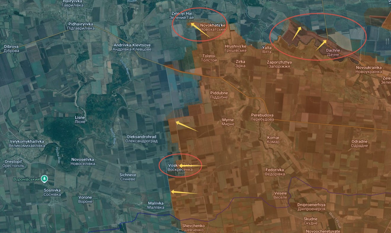 In particular, most of Voskresenka was captured, as well as areas just north and south of it. Most of Novokhatske to the north and areas around Tolstoi were taken, with Zeleniy Hai already under siege with its outskirts captured: