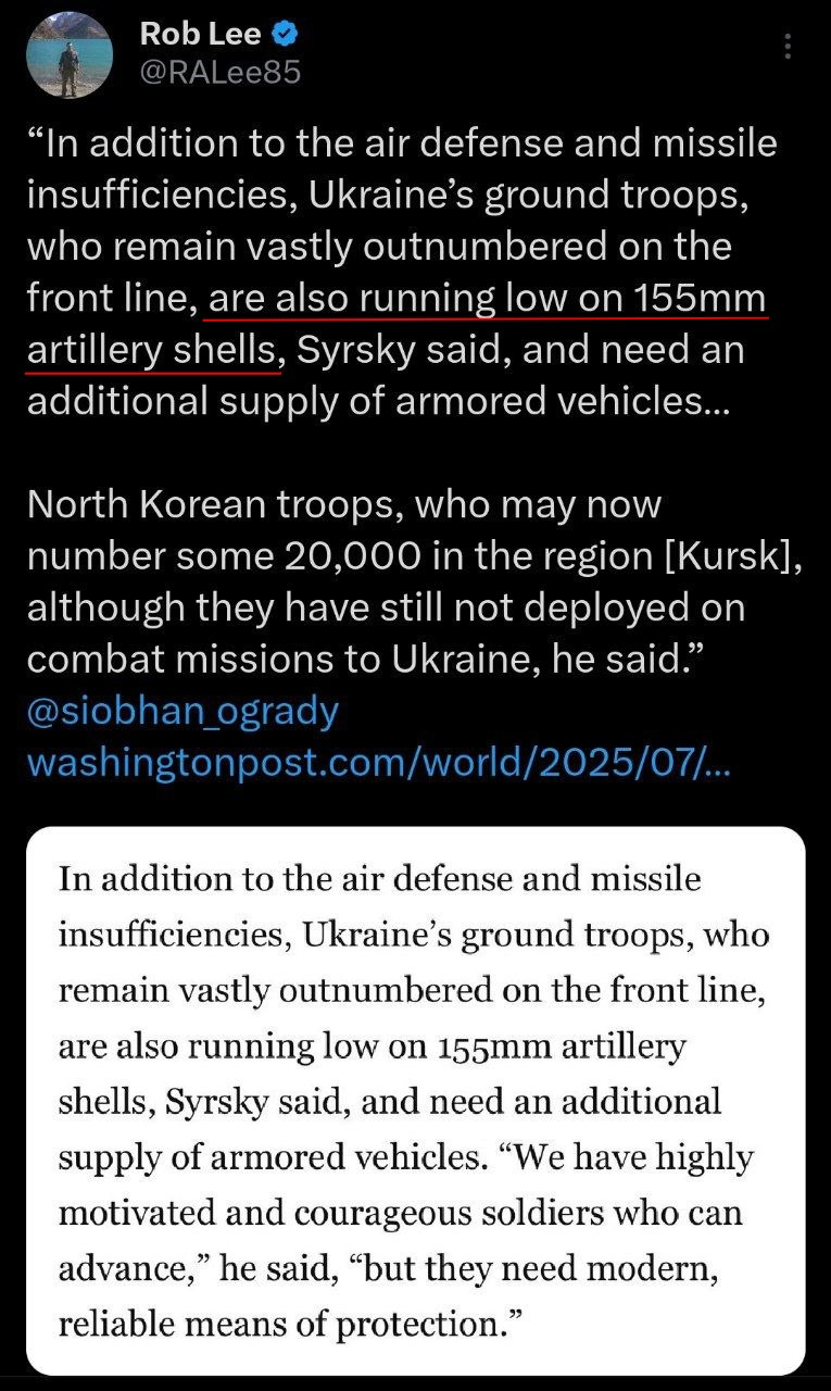 Speaking of supplies and ammo, Syrsky told WaPo that Ukraine is again running low on 155mm shells, contradicting recent sentiments that Ukraine has finally achieved some kind of “parity” with Russian artillery capabilities: