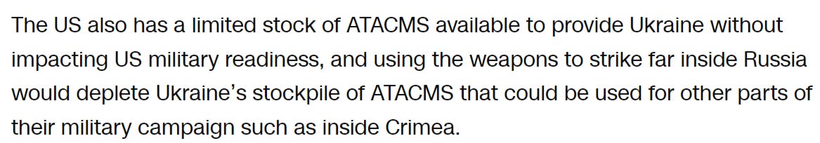The second issue is that, as CNN noted above, “several hundred” of these ATACMS, which potentially represents upwards of 20-40% of the entire US stockpile, have already been expended—and to what effect? If a major portion of the entire US stockpile has had negligible effect in degrading Russia’s warfighting ability, don’t you think that might be a kind of bellwether of things?