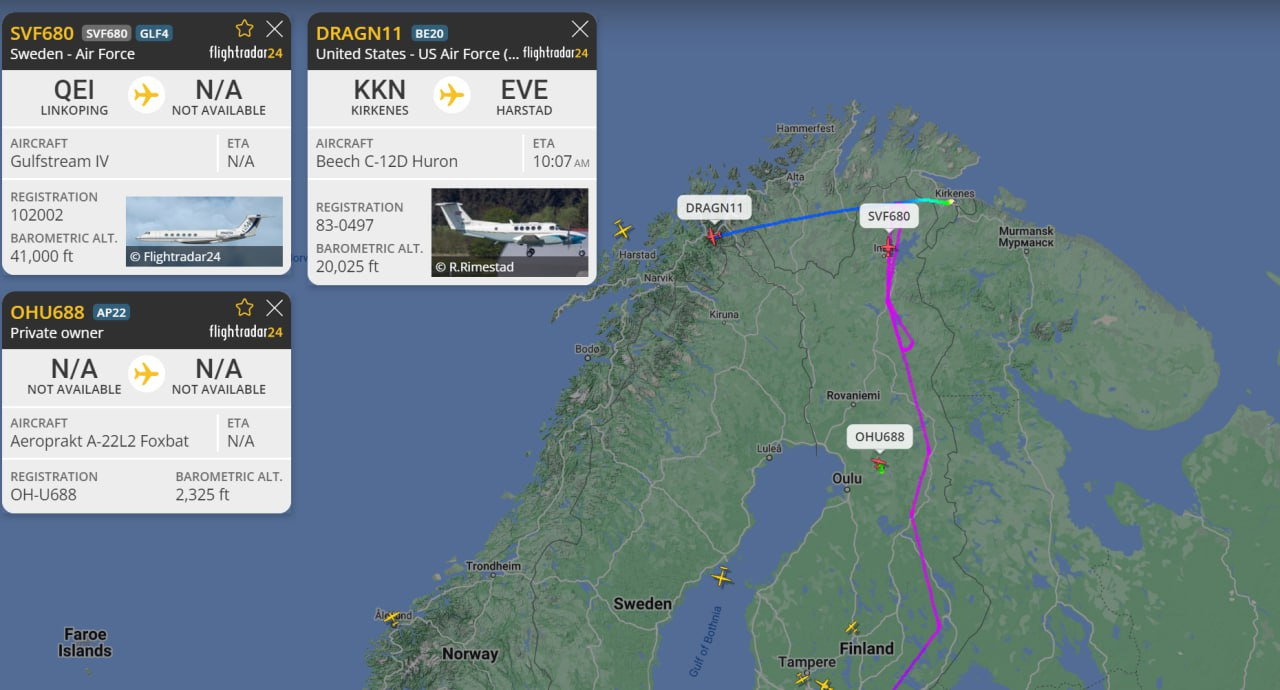 Things are unsettled again at Russia's northern borders. And again, a Swedish Gulfstream IV is flying there and... a small and inconspicuous Beech C-12D Huron with American government registration is taking off from a neighboring airfield in Kirkenes, Norway. It is also curious that a transponder for an A-22 aircraft, which is often used as a drone for raids on targets in the Russian Federation, suddenly appeared in Pudasjärvi, Finland. It is only 400 kilometers from Finland to the Olenya military airfield.