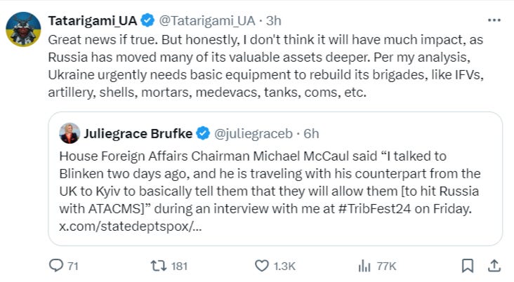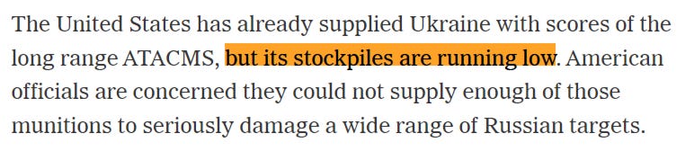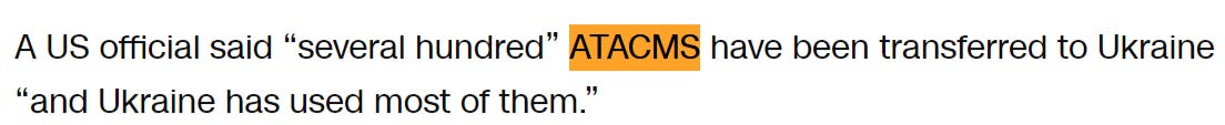 You’ll recall a couple reports ago I had detailed how the US itself may only have 1000-1500 total ATACMS in its inventory remaining and Ukraine was said to have received upwards of 200-300 of them.