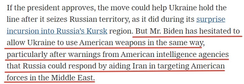 In classified briefings, American intelligence officials have expressed deeper concerns about direct, visible American participation in Ukraine’s move to seize and hold positions near Kursk. There are indications, they have warned, that Russia could provide technological help that would allow Iran and its proxy forces to attack American forces in the Middle East.